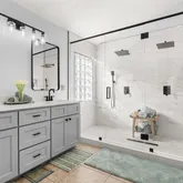 The master bathroom has been reimagined into a SPA-LIKE retreat, featuring a luxurious SUPER-DOUBLE SHOWER with DUAL RAIN SHOWERHEADS, handheld fixtures, FRAMELESS GLASS, and stunning 24" x 48" Marble-inspired Wall tile. The secondary bathroom shines just as brightly, with new cabinetry, quartz countertops, and updated mate black plumbing fixtures.