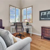 media cabinet, sliding glass door with custom shutters leading to a cozy back yard, as well as a