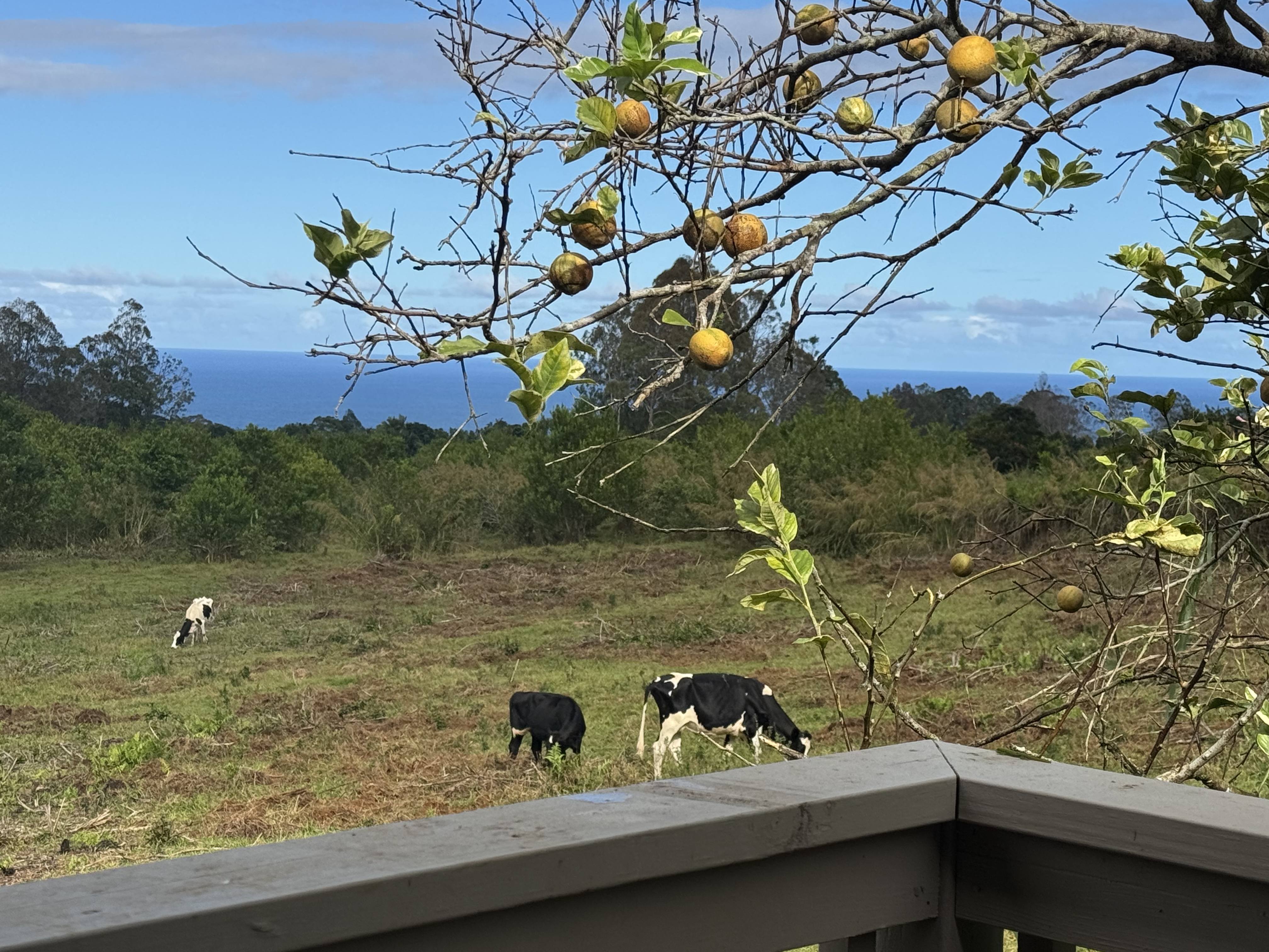 - Directions: half a mile north of Pepeekeo post office, go left (mauka) on Kaupakuea Homestead road. Pass 2 “lefts” and Lauhulu Rd (on right) and its gated on right with Horse Ranch sign….1.4 miles up from highway, (700 feet elevation). Flat long driveway to gate at the end leading into yard and Orchard . Park in Cottage carport & walk down to house. <br>To drive onto the pastures you will need 4 Wheel Dr. wear boots or sturdy shoes.