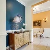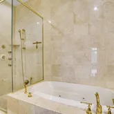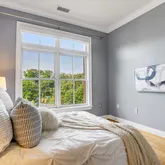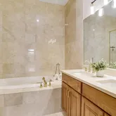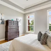 The primary bedroom features tray ceilings, custom moldings, a linen closet and a walk-in closet with custom organizers for ultimate storage solutions. The spacious and elegant primary bathroom is well laid out to include a double-sink vanity, a soaking tub and separate walk-in shower. The guest bedroom offers a built-in desk area for convenience when used as a home office, or can be reverted to a closet. The adjacent full bathroom has been beautifully updated with a large vanity, offering plenty of counter and storage space, a soaking tub with frameless shower door and a convenient linen closet with deep shelves.