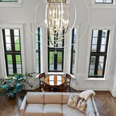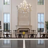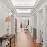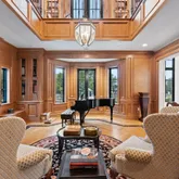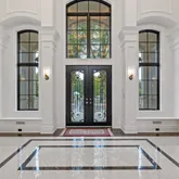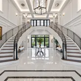 Entering through glass doors into the marble foyer, crowned by a coffered pearl ceiling, your eyes are immediately dazzled by the endless views of the reflecting pond, enchanted forest, and the glamour of the dueling staircases.