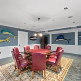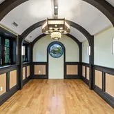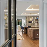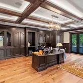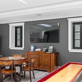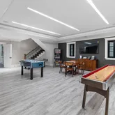 The doubled height in the music room locates hidden treasures but lead to a world of entertainments. Wrapped in walnut, the fully equipped onyx bar rivals the finest English tavern and sits seamlessly beside the family den. Bathed in natural light and warm in design, it’s a modern yet cozy setting for memories, moments, and laughter.
