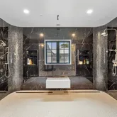 Features include geothermal HVAC, a state-of-the-art heat-sensitive fire suppression system throughout, and radiant heating. The seven en-suite bedrooms features walk-in closets and distinctive lighting. The master bedroom is a private retreat, which intended to mimic a four-season hotel suite, with a separate sitting area with fireplace and coffee bar, dual custom walk-in closets, and a spa-inspired bath.