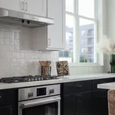 - Room Description: Gourmet island kitchen with bar seating and statement pendants that hang over the island; Bosch luxury stainless steel appliances include a built-in oven with a gas cooktop above, recirculating vent fan, a drawer microwave on the island, and a dishwasher; Shaker-style cabinetry; Tile backsplash; Oversized windows; Under-mount SS sink with windows behind