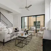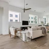 - Room Description: The main floor sits on the second story and boasts a luminous open floor plan wrapped in oversized windows that infuse the living space in natural light; designer ceiling fan; Oversized triple glass panel sliders open you living room onto the covered balcony; 12' ceilings and 8' doors; Wood floors; Pre-wired for surround; Smart home automation