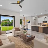 warmth and character to the living spaces. These wooden elements create a harmonious balance with the contemporary finishes, giving the home a unique and inviting atmosphere. Additionally, ceiling fans have been thoughtfully installed to enhance comfort and energy efficiency. The layout is functional and spacious, with three well-appointed bedrooms. The den adds versatility, serving as a home office or guest room. The master bathroom features a shower plus his and her closet and sinks.