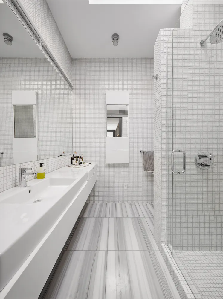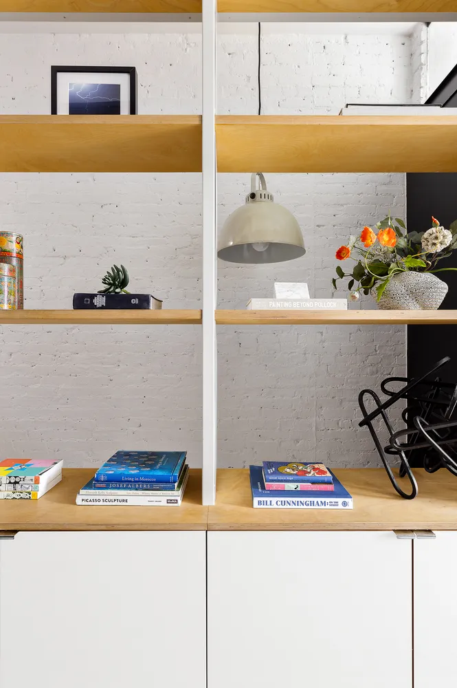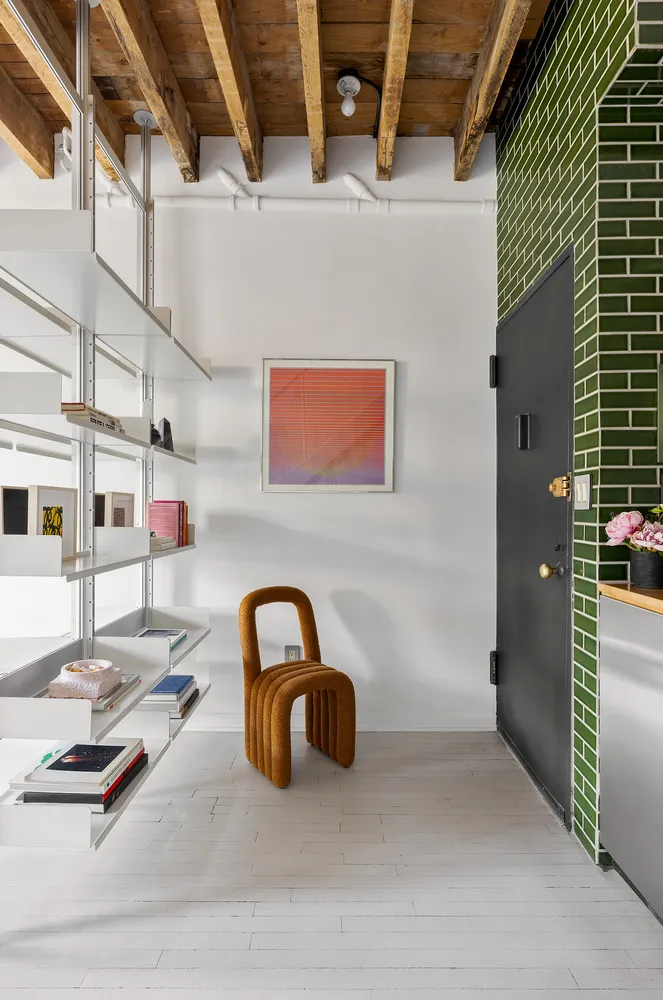 Head upstairs to discover a full-floor owner’s suite featuring custom shelving, walls of floor-to-ceiling wardrobe closets, and a laundry closet with a washer and vented dryer. Pocket doors reveal the serene south-facing bedroom with Freedom Tower views, while the bathroom gets natural light all day long through a large skylight. This home comes with the use of the roof area directly above the apartment.