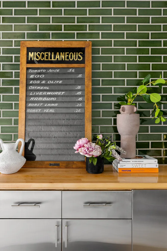 Arrive on the lower entertaining level and be swept away by soaring exposed beam ceilings, hardwood floors, and swaths of painted brick. The south-facing living room invites you to relax alongside open-sky views and a wood-burning fireplace. At 30 feet long, the space offers a generous footprint for seating and dining areas. In the eat-in kitchen, custom cabinetry is topped with stainless steel and butcher block countertops and dramatic green subway tile along with appliances that include a Sub-Zero refrigerator, a Marvel wine refrigerator, and a vented gas range and dishwasher by Bosch.