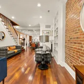 Rich Brazilian cherry floors, exposed brick, and beautifully detailed millwork set the tone throughout, complemented by crown molding, coffered ceilings, and multiple fireplaces that add depth and elegance. The expansive main level features an open-concept living and dining experience anchored by a generous, granite-appointed kitchen designed to accommodate gatherings with ease. The upper levels offer an impressive bedroom layout, including a luxurious primary suite with a spa-style bath featuring both soaking tub and separate shower. Additional bedrooms are generously sized, with one enjoying access to a private deck. The third level includes two large en-suite bedrooms, while the top floor provides a dramatic flex space ideal for entertaining, a family room, additional bedroom, or a creative retreat complete with a half bath and access to a spacious private outdoor roof deck.
