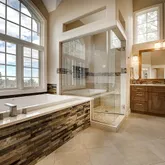 - Room Description: Primary suite bath is filled with rich woods cabinets, heated floors,, stone, soaking tub, dual closets, grand tall ceilings