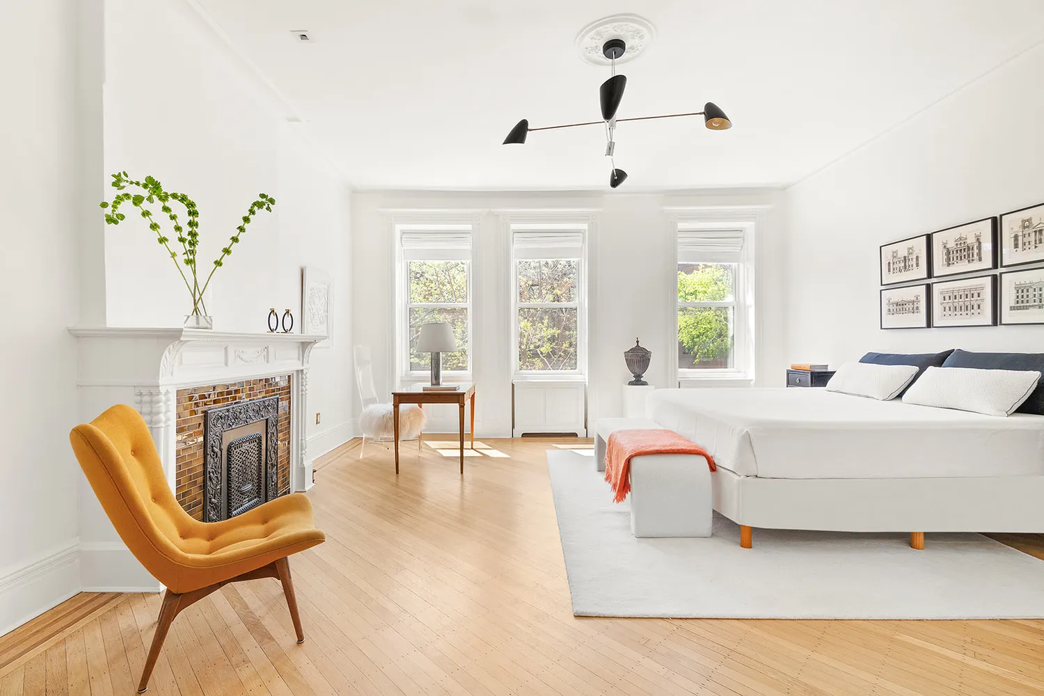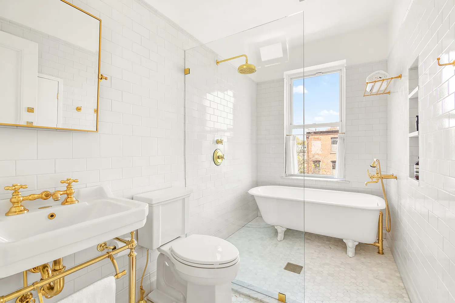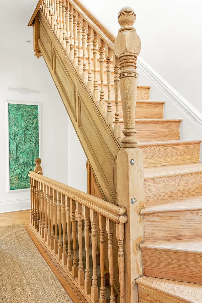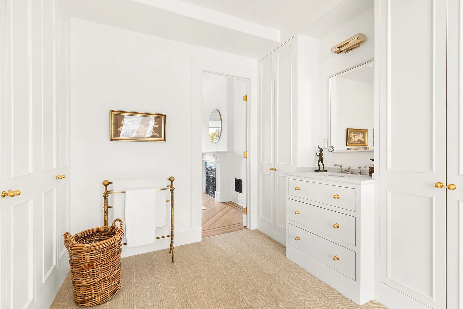 Comprising the primary suite, the third floor can alternatively be used as two separate bedrooms. The primary bedroom is full-width and extremely bright. Custom cabinetry lines the walk-in closet with a convenient dressing sink — a luxurious, modern take on Victorian-era pass-throughs and shaving sinks. There is a beautifully-restored decorative fireplace mantel in each room. The classically-designed marble bath perfectly straddles traditional and contemporary styling. At the top level there are three more bedrooms, two more decorative fireplaces and an elegant marble and tile bath with the original clawfoot tub. Top-end fixtures and hardware from Waterworks, Perrin & Rowe, Rohl, Lefroy Brooks, and restored antique hardware from Croft of London, polish off the two upper baths.