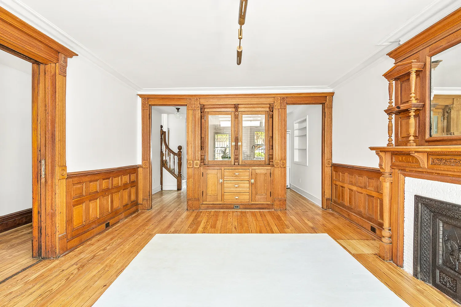 The elegant front hall with original encaustic tile and waist-high wainscotting leads into the front parlor featuring a striking floor-to-ceiling pier mirror complimented by a huge, arched triple-bay window with original stained-glass that saturates the room with south-facing light. The exposed woodwork has been meticulously restored to emit a pale-oak glow, and the original floors reflect a contemporary light tone throughout. The coved ceiling imbues an understated level of refinement.