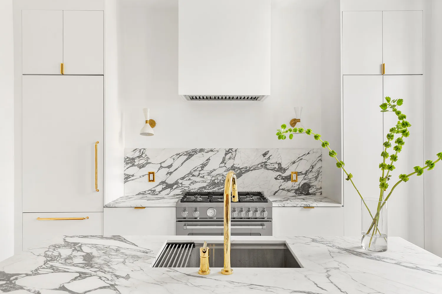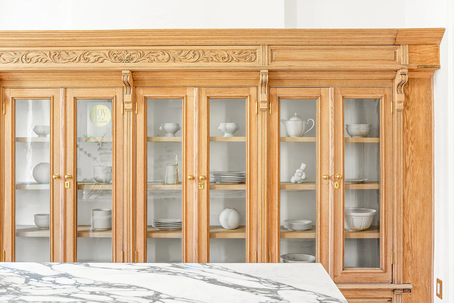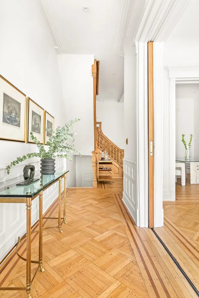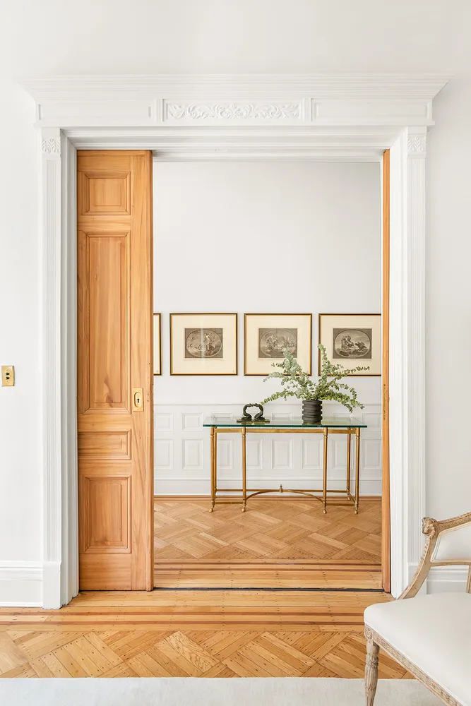 The dream kitchen is bespoke perfection with custom cabinetry, honed marble countertops, integrated Bertazzoni and Miele appliances, and Croft of London brass hardware. A restored original built-in cabinet graces an entire wall and makes this already impressive space an undeniable showstopper. Floor-ceiling custom mahogany doors lead out to the rear terrace and into the landscaped garden.