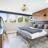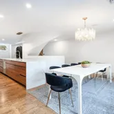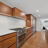 Step inside to a bright, open floor plan filled with natural light. Rich, authentic hardwood floors run throughout, complementing the home’s clean, modern aesthetic. The chef’s kitchen is a true showstopper, equipped with high-end appliances, a large waterfall island, and custom wood cabinetry providing ample storage and generous counter space. It flows seamlessly into a spacious dining area that opens to a private backyard through wall-to-wall sliding glass doors, perfect for indoor-outdoor living and entertaining. Also on this main level is a beautifully finished full bathroom, adding convenience and flexibility for guests or first-floor living.