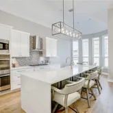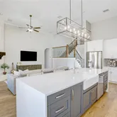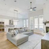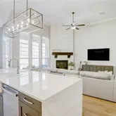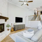 At the heart of the home, the fully remodeled gourmet kitchen is a true showpiece, boasting an oversized waterfall-edge island with farmhouse sink, two-toned cabinetry, quartz countertops, and premium stainless steel appliances—including a double oven and 5-burner gas cooktop. The kitchen opens seamlessly to the expansive living room, anchored by a dramatic floor-to-ceiling stone fireplace, creating the perfect setting for both relaxed gatherings and elegant entertaining.