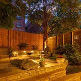 Exterior highlights include terraced walkways with lighting, a stone patio, and a reinforced parking pad