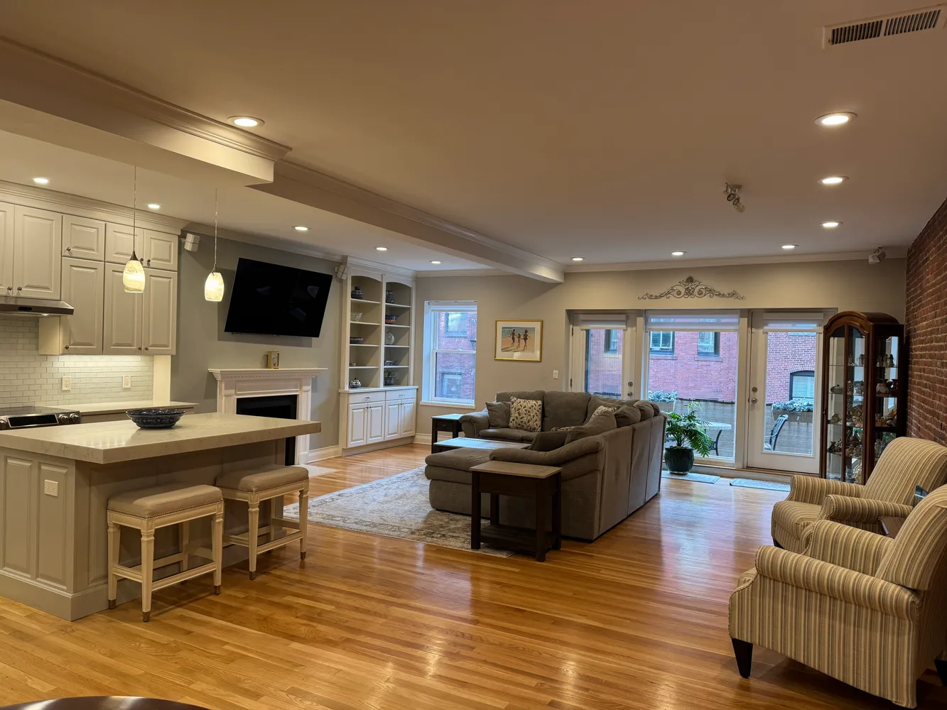 The living and dining spaces are defined by exposed brick, custom built-in shelving, and a decorative fireplace that anchors the room with quiet presence. A large picture window and two glass doors introduce abundant morning light, while continuous hardwood flooring creates a cohesive flow throughout the residence. The kitchen—fully reconfigured in 2019—features a substantial island with integrated storage, quartz countertops, soft-close cabinetry, and a refined mix of glass-finished tile and modern fixtures, offering a highly functional yet visually stunning backdrop for daily living and entertaining.