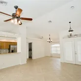 - Interior Features: Cathedral Ceiling(s), Ceiling Fan(s), High Ceilings, Living Room/Dining Room Combo, Open Floorplan, Primary Bedroom Main Floor, Split Bedroom, Stone Counters, Thermostat, Walk-In Closet(s), Window Treatments