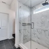 The primary suite is a true retreat, featuring a spa-like ensuite bath with dual vanities, a glass-enclosed shower, and a generous walk-in closet. A first-floor guest suite provides ideal flexibility for visitors, a home office, or multi-generational living, while additional bedrooms offer comfortable space for family or guests.