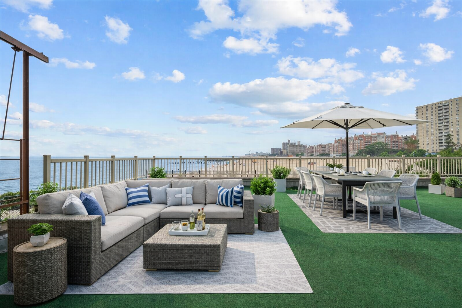 Every window in this home faces the ocean, filling the space with natural light and unobstructed coastal views. The layout features a king-sized primary bedroom, a generously sized second bedroom, a windowed eat-in kitchen, and a separate formal dining room. The spacious living room opens directly to a truly one-of-a-kind feature: your own extravagant private terrace — the perfect canvas for an outdoor lounge, garden, or entertaining area with the sound of waves in the background.