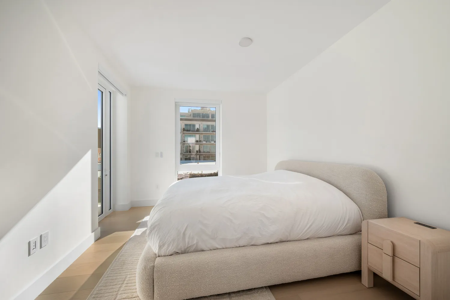 The Primary Suite has direct access to a private balcony facing the Zen garden, a generous walk-in closet, and a true five-fixture bath. Finished in honed La Perla limestone with a rain shower with thermostatic controls, and a double White Oak vanity with soft cove lighting and Watermark hardware, it feels calm and elevated.