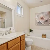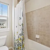 - Room Description: Shower/tub with a door separating the vanity from the toilet and shower.