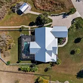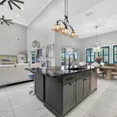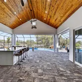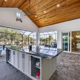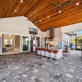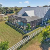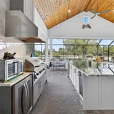 Step outside to expansive custom covered lanai highlighting outdoor kitchen with built-in LP gas grill, large center island for entertaining, wood plank ceiling creating cozy atmosphere, automatic StormSmart screens to provide privacy and protection in any weather, screened heated saltwater pool and spa plus brick firepit with underground 500-gal propane tank to enjoy cool winter nights. The beautifully landscaped grounds, adorned with fruit trees like lemon, mango, almond, and lime, add to the home's charm. Additional features include covered front porch to enjoy your morning coffee, large laundry room with extensive cabinetry and Butler's pantry, oversized 3-car garage with A/C and extra insulation, two full-size A/C units and tankless water heater. Standing seam metal roof with commercial gutters, generator plus impact windows and doors offer ultimate peace of mind. Outside, you'll find custom walkways, gazebo, shed for extra storage, and a fenced backyard ideal for your furry friends.