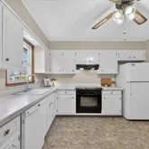 The kitchen is conveniently located just off the dining area and features a classic white ceramic sink, blending charm with everyday practicality, along with an eat-in area perfect for casual dining.