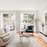 Unit 3 is a two-bedroom, two-bathroom home with two double exposures and a private balcony. As soon as you walk into the apartment, you will encounter an extra-wide 25 foot living/dining area with three large windows looking over green tree-tops. The open kitchen includes Caesarstone countertops, modern sleek cabinets and Bosch stainless steel appliances. Two large bedrooms with excellent closet space and two full bathrooms are located in the rear of the apartment to provide maximum peace and quiet. Elegant finishes, along with a state-of-the-art washer/dryer and a Mitsubishi heating/cooling system complete this true gem of a property.