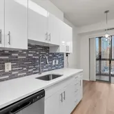 The brand-new kitchen features soft-close cabinetry with pull-out drawers, new stainless steel appliances, elegant quartz countertops, a stylish tile backsplash, and an inviting eat-in breakfast area with updated lighting.