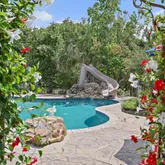 Step into your own private paradise where comfort and beauty come together seamlessly. Just beyond the back door, a spacious covered porch invites you to relax in the shade, catch the game on the outdoor TV, or simply unwind in comfort. Beyond the porch, the backyard transforms into a tropical retreat. At its heart is a stunning gunite saltwater pool with a natural stone waterfall and slide—surrounded by stacked stone accents that enhance its resort-style feel. A nearby seating area centers around a charming wood-burning brick fireplace, perfect for cozy evenings outdoors. Lush, mature tropical landscaping and vibrant flowering plants complete the setting, creating a serene and visually captivating escape. The grounds are professionally maintained and thoughtfully designed for both relaxation and entertainment. Property Highlights: