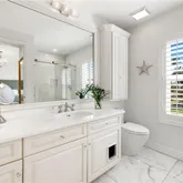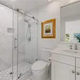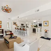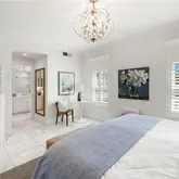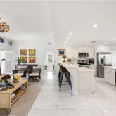 Elegant Carrera marble floors run throughout the residence, complemented by stunning Mystery White marble countertops in the kitchen and bathroom vanities. The open layout includes a formal dining area and an eat-in kitchen with bar seating. The kitchen is equipped with high-end stainless steel appliances, offering both style and modern functionality.