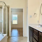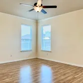 The primary suite is carpet-free and generously sized, featuring a ceiling fan and multiple windows. The primary bathroom delivers comfort and relaxation with a large walk-in closet, a deep soaking tub, and a walk-in shower to suit your preferences. Additional bedrooms are spacious and share a full bathroom with a tub/shower combo. A dedicated laundry room includes full-size washer and dryer for added convenience. Step outside to an expansive covered patio overlooking a large fenced backyard—perfect for outdoor dining, relaxing, or entertaining. Prime Location: