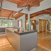 The living room is adorned with a gas fireplace, creating a cozy atmosphere for relaxation. A renovated hall bath showcases Bulthaup design and Dornbracht fixtures, while two ample-sized bedrooms offer versatile options for home office space.