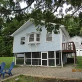 Dead end road (last home in). Offers great water frontage with breathtaking water views, even a small sand beach. Large two-story garage with potential to finish an in-law apartment or guest quarters (zoning permitted). Home features living room overlooking the water, dining room, kitchen with dining area, two bedrooms and bathroom. Screened in rooms on the water side. Has its own boat ramp.Lovely year-round home on Cold Stream Pond (Lake)