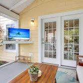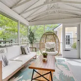 The chef's kitchen shines with quartz countertops, a spacious island, stainless steel appliances, a new dishwasher, and a walk-in pantry. Just off the sunlit eat-in kitchen, a 12x10 enclosed patio has been transformed with a shiplap ceiling, swing door, and a built-in shelf for an outdoor television, perfect for indoor-outdoor living.