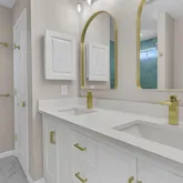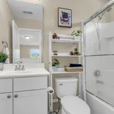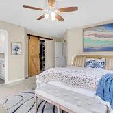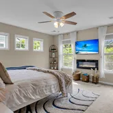 Upstairs, three beautifully appointed bedrooms await, including one with access to the upper porch overlooking the lake. The primary suite is a true sanctuary, featuring motorized blinds, an electric fireplace, a new barn door at the closet, and a $30,000 spa-worthy bathroom renovation with a spacious glass shower enclosure, designer tile, double vanity, upgraded fixtures, new flooring, and fresh paint. The second bathroom has also been upgraded with a new glass shower enclosure.