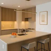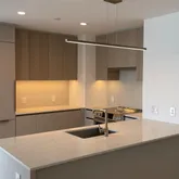 • Sand ash veneer cabinetry with Viatra quartz countertops and backsplash