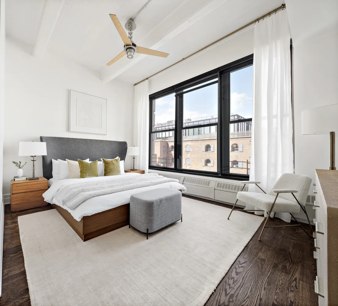 A gracious entry gallery leads to an expansive great room, where matte-finished oak hardwood floors complement the open, airy layout. The renovated kitchen is equipped with lacquer cabinetry,...Rarely available B-line in the Sweeney Building. This exceptional three-bedroom loft captivates with soaring 11-foot concrete beamed ceilings, oversized windows, and striking views of Brooklyn Bridge Park and the East River. Thoughtfully designed, it perfectly balances industrial character with modern comfort.