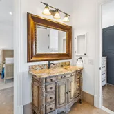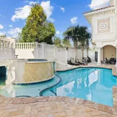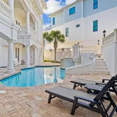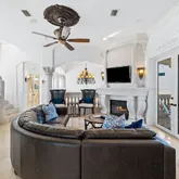Venture further to discover the mesmerizing backyard oasisa secluded pool area embraced by a majestic stone wall that grants serenity amidst the lively 30A. Here, indulge in the built-in grotto, delight in the cascading waterfall, or relax in the serene spa tub. Ascend the stately stone staircase to the second floor, where the main family room beckons, complete with a large flat-screen TV, balconies offering sweeping gulf views, and an additional balcony overlooking the pool courtyard.