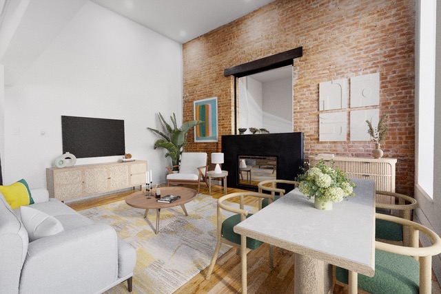 The main level features 13+ ceilings, hardwood floors, a wall of exposed brick encasing a brand new electric fireplace and a built-in mirror. Oversized, 8’ Windows allow an abundance of steady light all day and tree-lined street views. The updated open kitchen features a wide breakfast bar, stainless steel appliances, including a gas range and built-in microwave, new...Convertible two-bedroom, one-bathroom East Village loft featuring three levels of outstanding living space and exceptional storage!