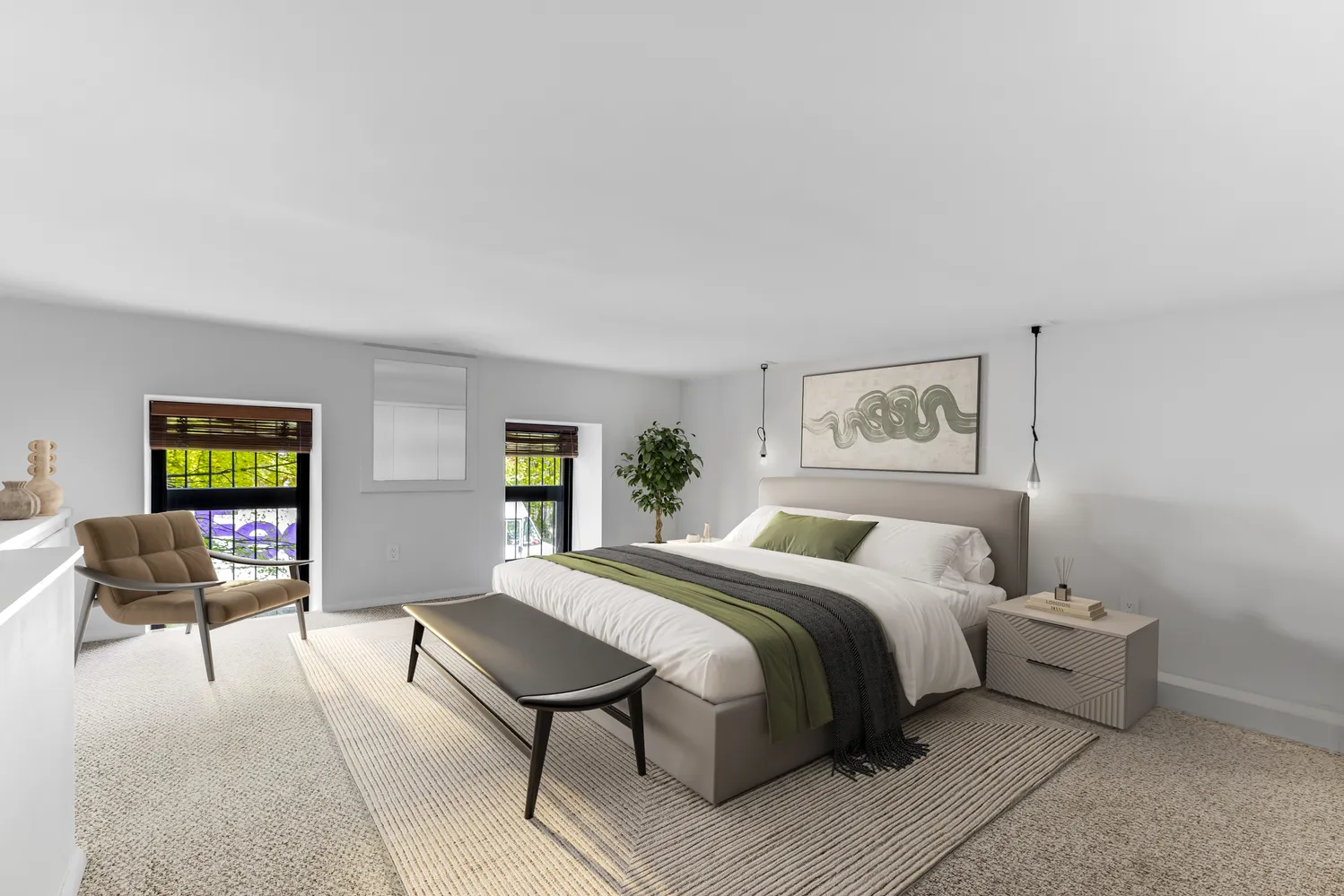 Above is the loft sleeping loft of your dreams large enough for a king-size bed featuring Berber-style carpeting, built-in cabinetry and a wall of custom closets filled with shelving and drawers. The lower level offers an expansive, flexible living space with brand-new flooring perfect for a 2nd bedroom, home office, game room, gym, media room, walk-in closet, or all of the above.