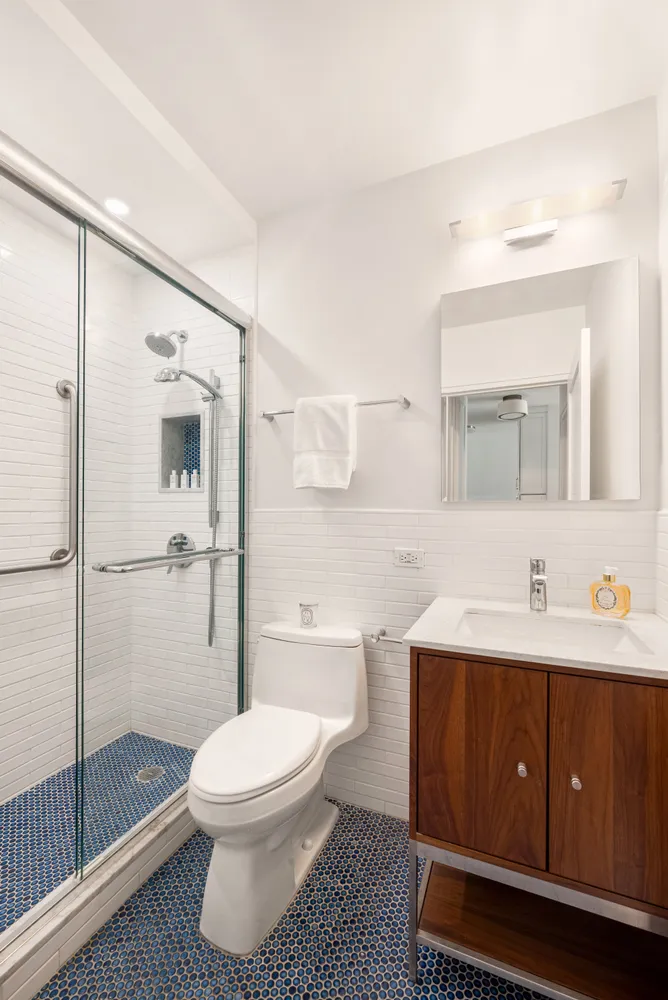 The renovated bathroom features a glass-enclosed shower, contemporary fixtures, and blue penny-tile floors. Ample closet space throughout the apartment completes this well-designed home.