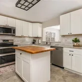 Inside, the home feels fresh and updated. The kitchen features real wood cabinetry with maple doors, granite countertops, tile flooring, a walk in pantry, and a large butcher block island. The primary suite includes vaulted ceilings and an updated bathroom with double vanity and tiled shower with glass enclosure.