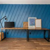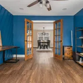 One of the most unique spaces in the home is the dedicated office, perfect for working from home. It features five floor to ceiling windows, a custom accent wall, and wood stained French doors, creating a bright space that still offers privacy.