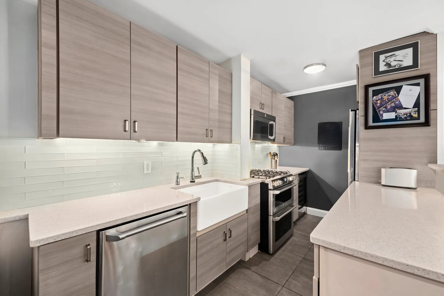 Spanning approximately 800 square feet, unit 2G welcomes you with tall ceilings, hardwood floors and windows on three exposures. A gracious foyer with a large closet ushers you into the oversized living/dining room, offering a generous footprint for relaxing and entertaining surrounded by south-facing windows, recessed lighting and a designer chandelier. The renovated open kitchen wows with beautiful cabinetry, quartz counters, glass tile backsplashes and a large farm sink illuminated by undercabinet lighting. Enjoy casual meals and conversation at the breakfast bar while a fleet of stainless steel appliances -- including a gas range with double ovens, a dishwasher, a wine refrigerator, a built-in microwave and wine fridge -- make cooking and cleaning a breeze. The king-size bedroom provides a wall of closets, ceiling fan and plenty of space for a home office or fitness area. A windowed bathroom with a large tub/shower, contemporary fixtures, and classic subway and penny tile completes this move-in ready Yorkville retreat.