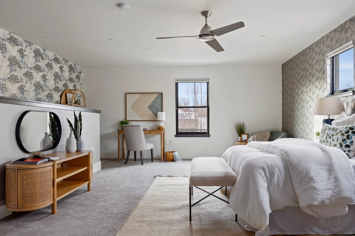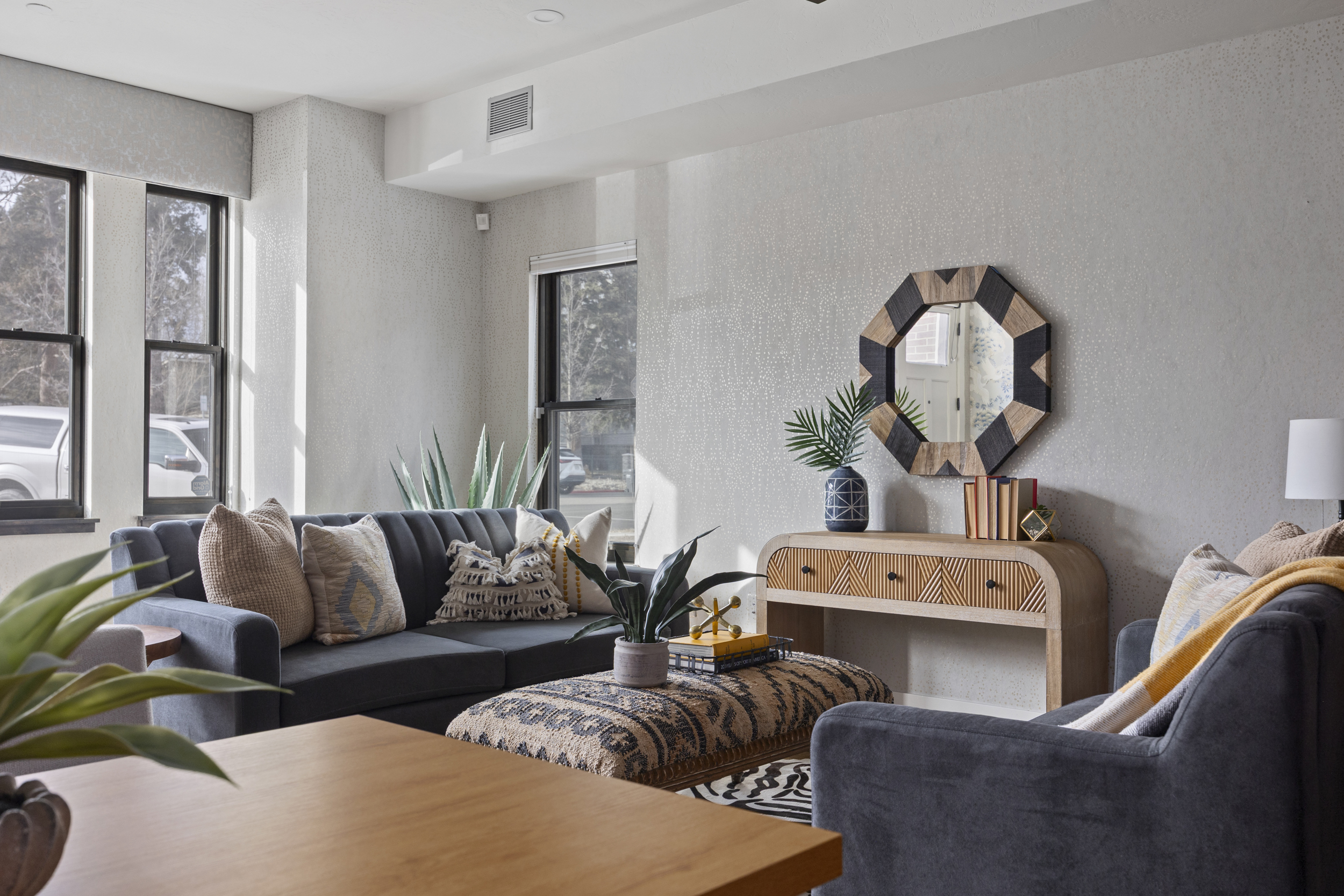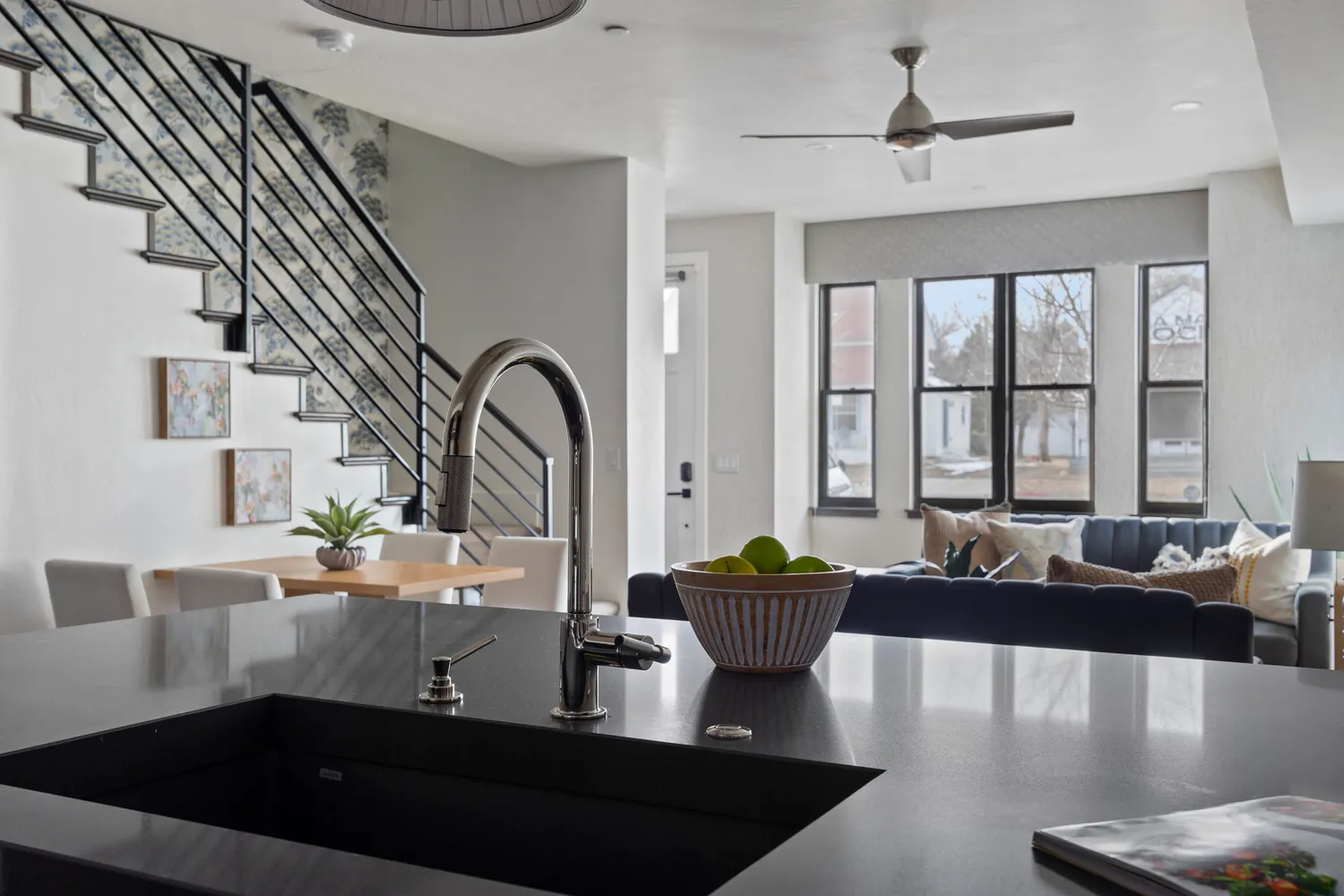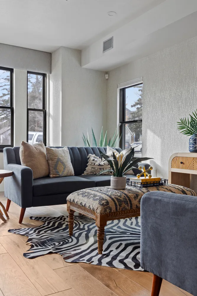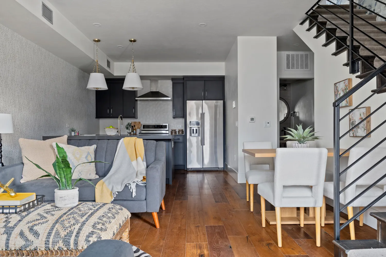 Step inside to a welcoming foyer, complete with a built-in drop-zone and clever overhead storage. The main level boasts 10-foot ceilings and warm hardwood floors, creating an airy, open atmosphere. Natural light pours through expansive Sierra Pacific windows, highlighting the impeccable craftsmanship, from Emtek hardware to custom light fixtures and high-end plumbing details. Designed with STC-60 sound engineering, you’ll enjoy peace and quiet even in the city’s lively core.
