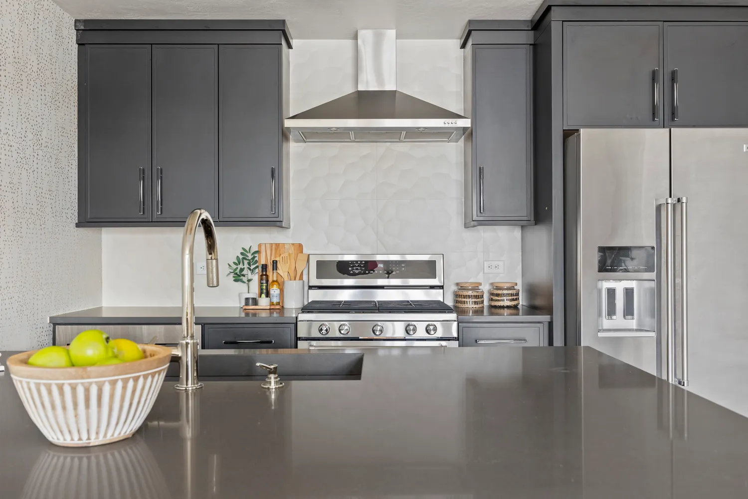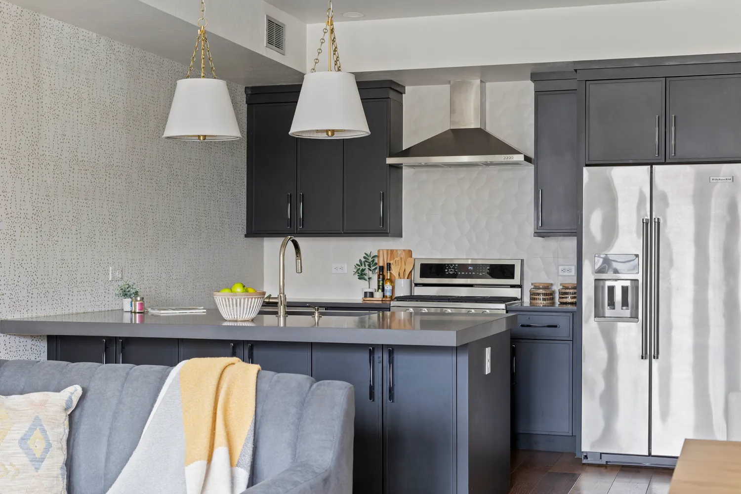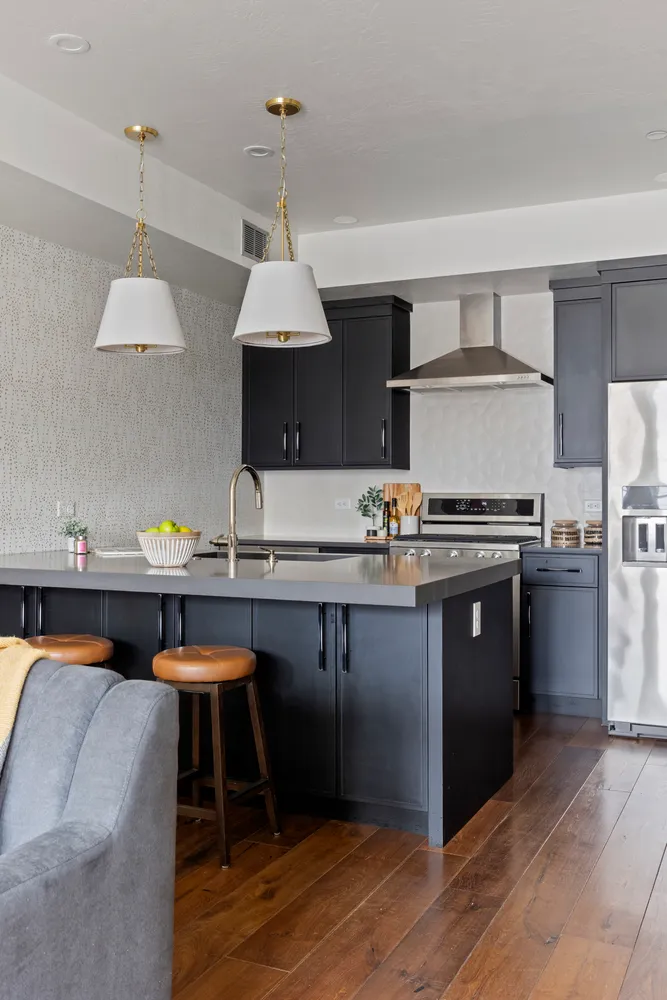 The chef’s kitchen is a masterpiece, featuring Tischlerei cabinetry, a spacious island with double-thick quartz countertops, and concealed under-island storage. Top-of-the-line stainless steel appliances include a gas range, refrigerator, range hood, microwave, and dishwasher—everything you need to entertain with ease. Adjacent, an oversized living room accommodates a large sectional or dual sofa.