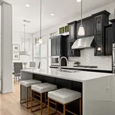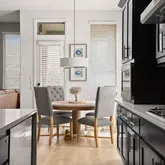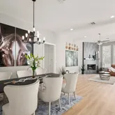 Inside, luxury vinyl wood plank flooring and abundant natural light set an elegant tone, guiding you into a beautifully designed open floor plan. The kitchen serves as a true centerpiece, showcasing a dramatic waterfall-edge island, stainless steel appliances, gas cooktop, built-in double ovens, and a microwave with air fryer capability—crafted for both elevated entertaining and everyday ease. The space flows effortlessly into the living and dining areas, creating an atmosphere that is both sophisticated and inviting.