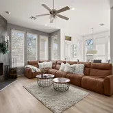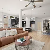 Inside, luxury vinyl wood plank flooring and abundant natural light set an elegant tone, guiding you into a beautifully designed open floor plan. The kitchen serves as a true centerpiece, showcasing a dramatic waterfall-edge island, stainless steel appliances,...Gracefully positioned along a tranquil greenbelt and walking trail in Parkside at Mayfield Ranch, this exceptional one-and-a-half-story residence at 304 Fort Cobb offers refined design, thoughtful upgrades, and seamless indoor-outdoor living.